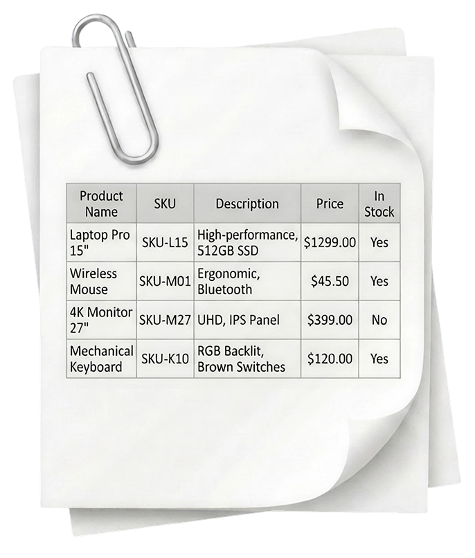 Add knowledge from PDFs, Word documents, Excel spreadsheets, and CSV files.